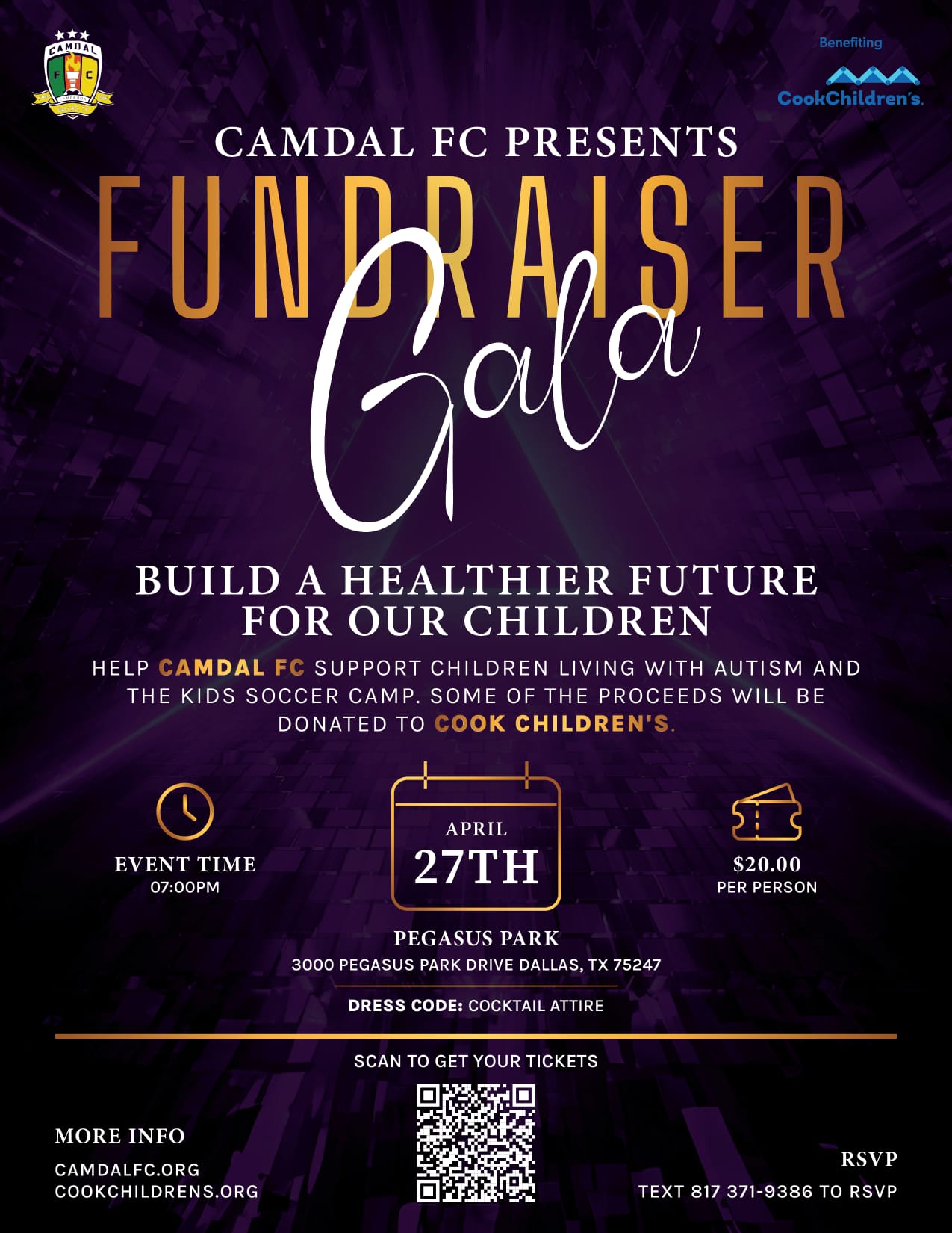 CAMDAL FC has partnered with COOK CHILDREN’S to support with children living with Autism and the kids Soccer Camp. You are invited to this FUNDRAISER GALA to BUILD A HEATHIER FUTURE FOR OUR CHILDREN.